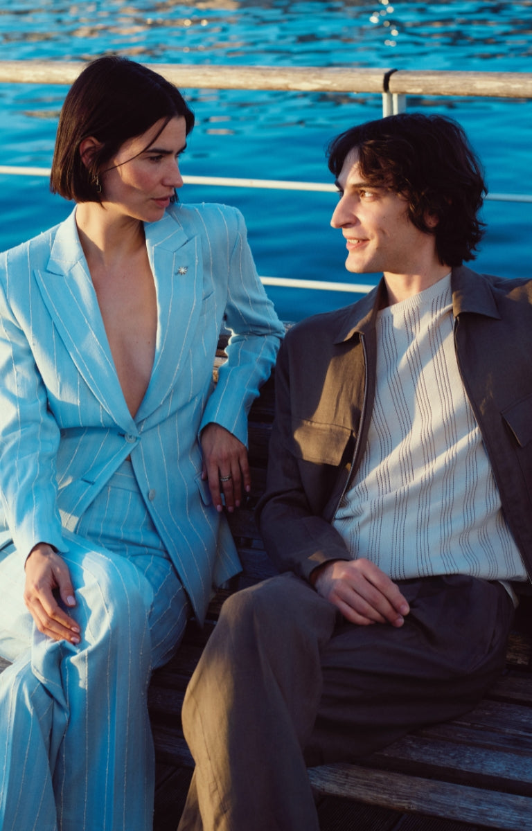 La collezione si distingue per un approccio innovativo che valorizza texture e fibre naturali attraverso trattamenti ricercati. Il lino è al centro della proposta, presentato in versioni lavate o miste a viscosa e lyocell, declinato in righe bicolore e madras pastello dalle nuance naturali.